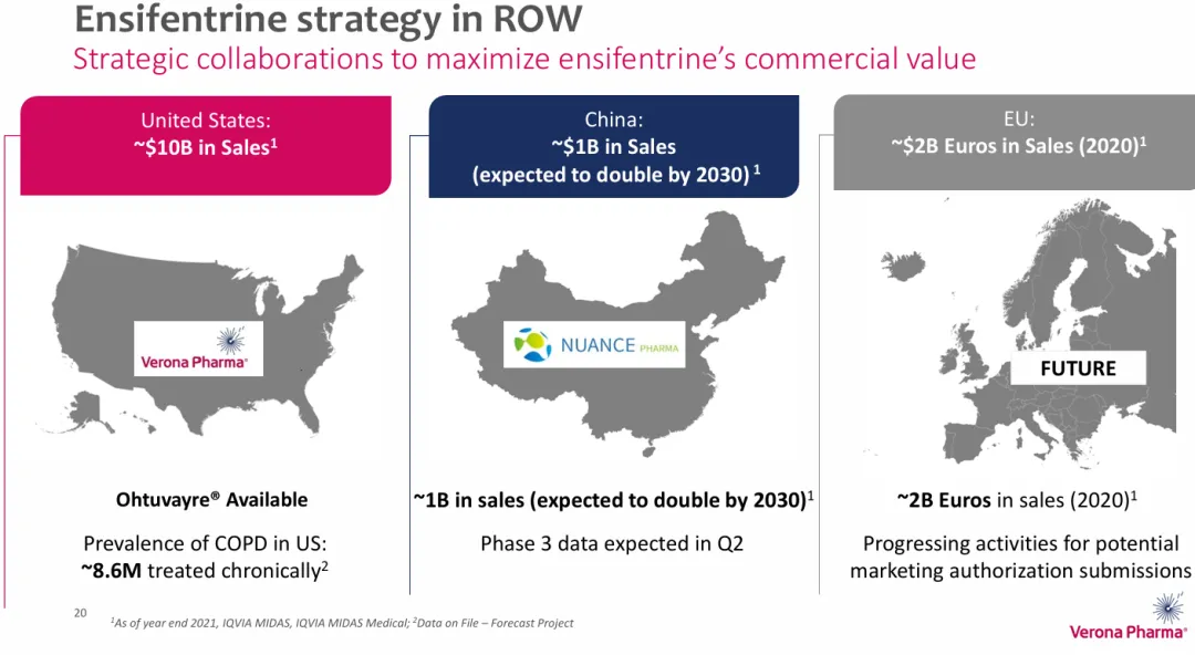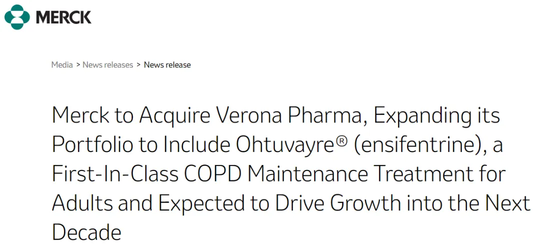 7月9日,默沙东与专注于呼吸系统疾病的生物制药公司Verona Pharma plc(NASDAQ:VRNA)宣布两家公司已达成一项最终协议,根据该协议,默沙东公司将通过子公司以每股美国存托股份(ADS)107美元的价格收购Verona Pharma,每股代表8股Verona制药普通股,总交易价值约为100亿美元。2021年,Verona Pharma与Nuance Pharma(优锐医药)就慢性阻塞性肺疾病(COPD)药物——Ensifentrine大中华区(中国大陆、台湾、香港和澳门)权益达成总价值2.19亿美元的合作协议,Verona获得一笔2500万美元的预付现金,以及优锐医药母公司Nuance Biotech对Verona普通股的1500万美元股权投资,此外,Verona还有资格获得1.79亿美元里程碑付款。