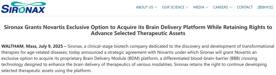 https://www.prnewswire.com/news-releases/sironax-grants-novartis-exclusive-option-to-acquire-its-brain-delivery-platform-while-retaining-rights-to-advance-selected-therapeutic-assets-302500323.html#:~:text=WALTHAM%2C%20Mass.%2C%20July%209%2C%202025%20%2FPRNewswire%2F%20--%20Sironax%2C,the%20brain%20delivery%20of%20therapeutics%20of%20various%20modalities.
