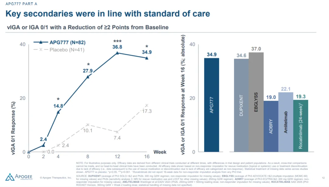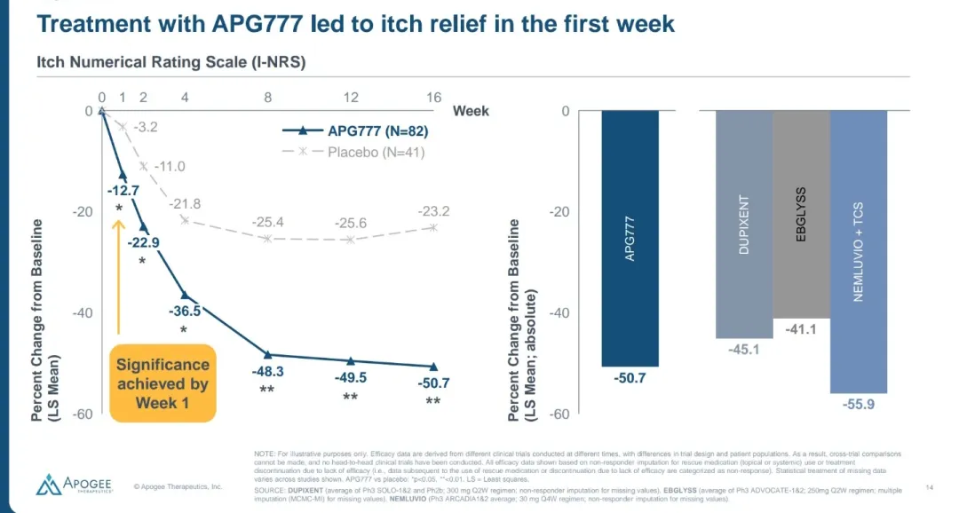 APG777 的研发有望改变特应性皮炎的治疗格局,为患者提供一种更安全、更有效且患者依从性更好的治疗方案。Apogee此次带来的数据仅仅在EASI75数据上可以“击败”赛诺菲的Dupilumab和礼来的Lebrikizumab,然而在IGA0/1和瘙痒指标上,Apogee试图掩盖药效差,没有展示对照组数据。安全性方面总体比较耐受,高达14.6%的结膜炎,比Dupilumab还要高,这个在后期B部分以及52周的临床需多家关注。虽然管理层声称药效非常的这些也为什么当天股价大跌,市场不买账的原因。