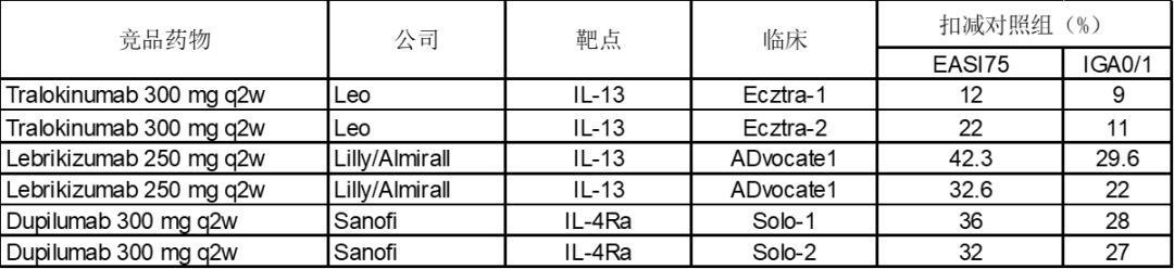 小编检索数据后做了个竞品的对比,APG777的IGA0/1的数据只有17.6%,仅仅和Leo的IL-13抗体Tralokinumab相当,远逊于Dupilumab和Lebrikizumab。
