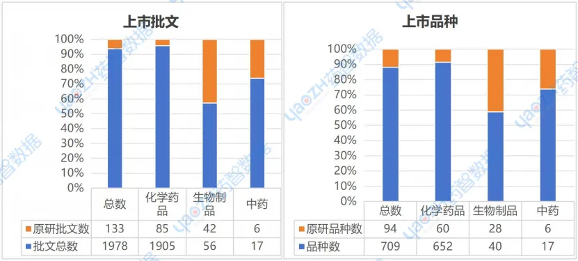 2025年上半年上市的1978个药品批文中,133个为原研药品,原研批文占比为6.72%。品种方面,709个上市药品中,94个为原研药品,原研药品占比为13.26%。