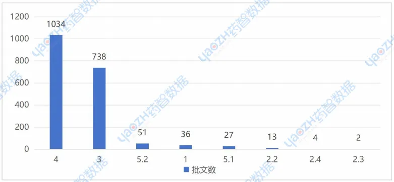 获批化药中,尤以4类仿制药获批批文数最多(1034个),3类药品次之(738个),5.2类排第三(51个),其后依次为1类(36个)、5.1类(27个)、2类(19个)。