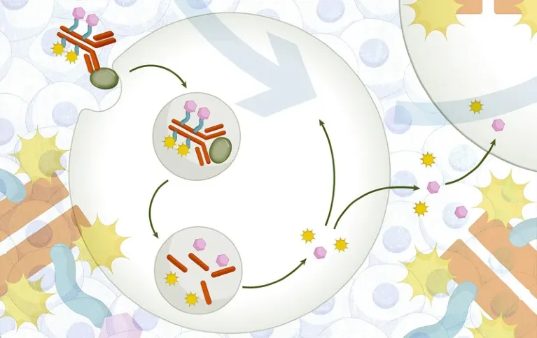 其关键在于差异化的连接子设计,实现载荷的时序控制释放:依沙替康连接子更稳定,主要在抗体被肿瘤细胞内化后断裂,实现精准杀伤(裂解后释放的游离依沙替康也可产生旁观者效应);雷公藤甲素连接子则设计为在肿瘤微环境中、内化前即断裂,快速清除周边癌细胞,增强整体旁观者效应。