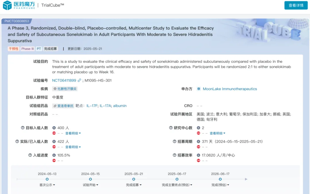 化脓性汗腺炎是一种慢性炎症性皮肤病,会导致疼痛性脓肿和组织瘢痕形成,长期存在诊断与治疗不足的问题。Moonlake的III期研究或将改变这一现状——其核心候选药物sonelokimab是新型三特异性纳米抗体,可以靶向与该病相关的两种炎症细胞因子及白蛋白,凭借独特的作用机制和分子量较小的特性,有望较现有生物制剂(艾伯维Humira、优时比Bimzelx和诺华的Cosentyx)实现更优疗效与更低给药频率。