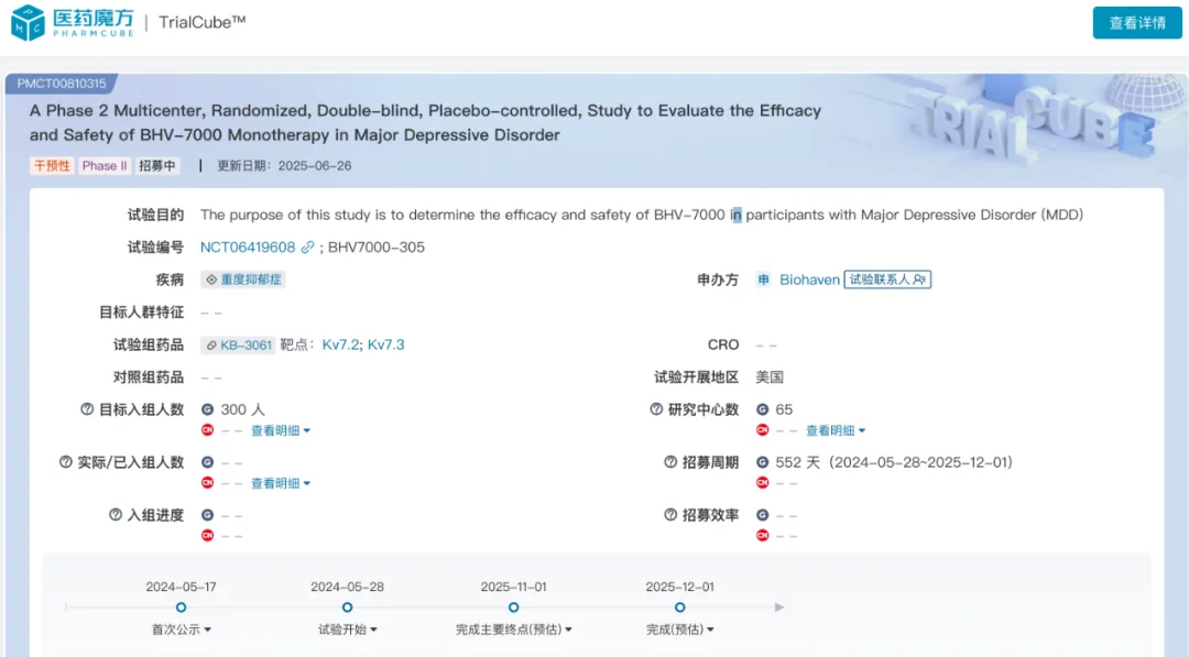 Biohaven出售偏头痛业务获近120亿美元后,正寻找新业务支柱。其核心看点是年底出炉的重度抑郁症研究结果。该公司通过与Knopp Biosciences的交易获得了BHV-7000,该药专门靶向位于神经系统中调节神经元活动和兴奋性的两种钾离子通道。