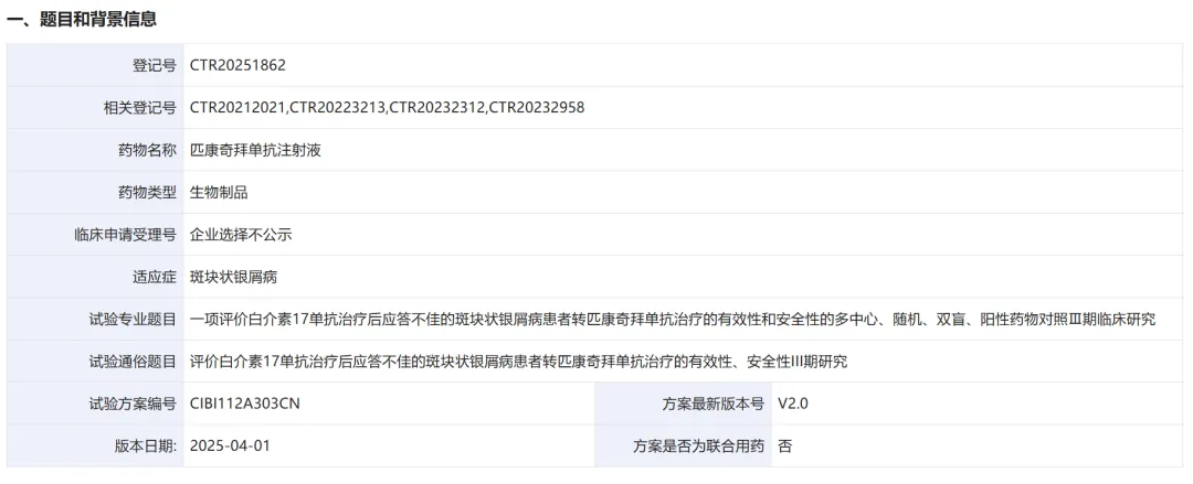 同时信达生物的NCT06945107,同样引人注意:双盲设计、纳入既往至少接受≥16w IL-17抑制剂(标签剂量≥80%),sPGA≥2且BSA≥3%转化至Picankibart单抗,loading3针后每12周给药,双leading 山皮张福仁和上海十院顾军教授,对照组:维持IL-17抑制剂。亮点:切实纳入中度人群,纳入中国市场最大的两款生物制剂经治疗效不满意的人群,解决临床痛点和需求;设置阳性对照组,主要终点:16周sPGA0/1,次要终点:评估点为16周/44周。对比之下,海外大卖的Risankizumab做的耐药研究是一项单臂研究,并未设置对照组。
