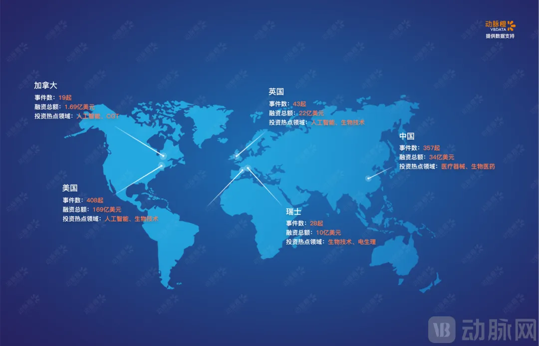 值得关注的是,尽管美国和中国融资下滑,但英国和瑞士却在逆势增长。英国虽然融资事件同比减少了33%,但融资金额却大涨114%。瑞士同样如此,在融资事件同比减少15%的基础上,融资金额大涨51%。