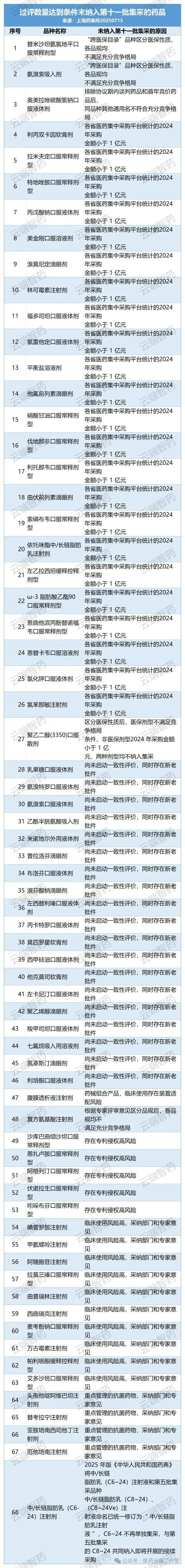 郑颐介绍,第11批集采聚焦临床使用成熟、市场竞争充分的品种,更好发挥集采的规模效应,在满足遴选条件的基础上,结合既往品种遴选规则和集采政策优化要求,排除存在以下情形的品种: