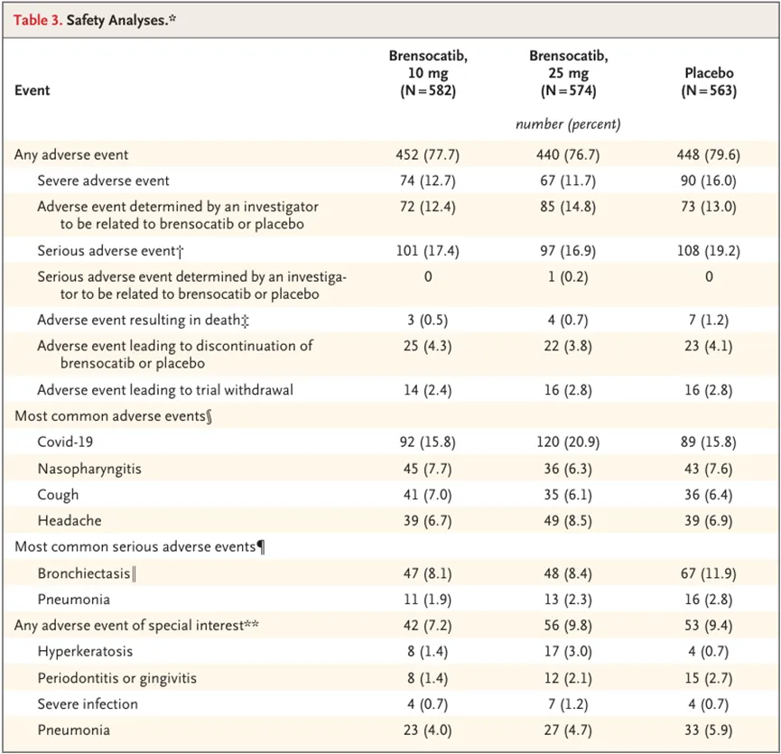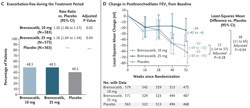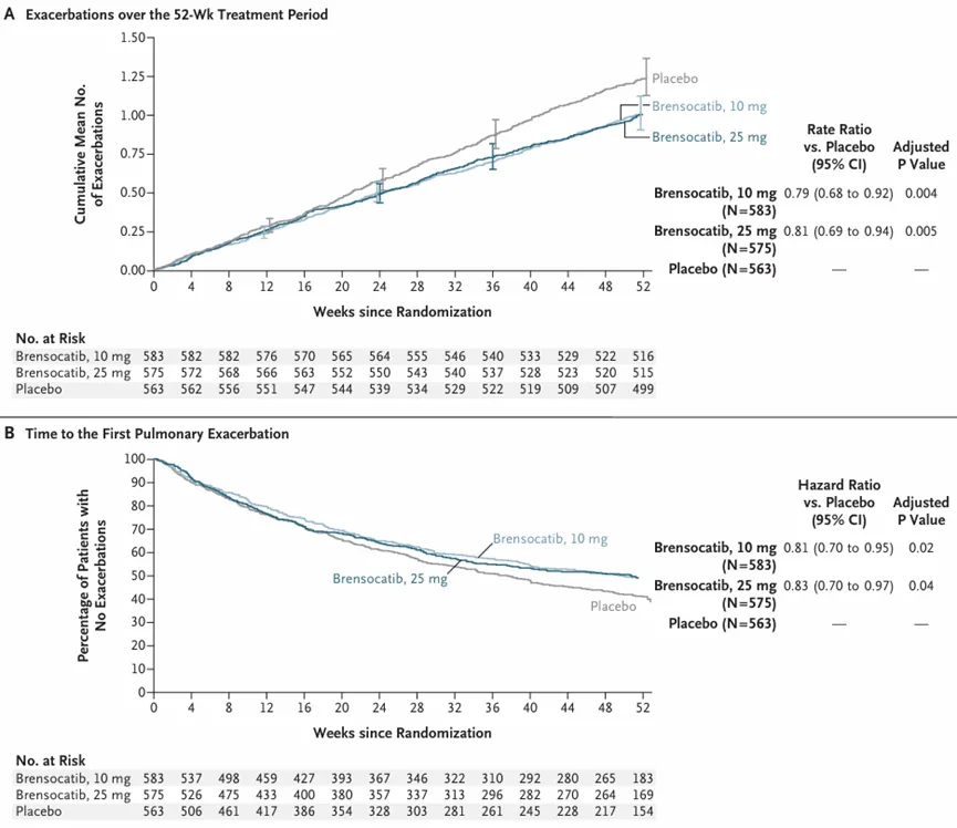 Brensocatib的上市申请是基于III期ASPEN研究的积极结果。该研究纳入了1721(其中包括41例青少年)例非囊性纤维化支气管扩张症患者。结果显示,治疗第52周时,10mg和25mg剂量组患者的年化肺部恶化发生率均低于安慰剂组(1.02 vs 1.29,比率为0.79,P=0.004;1.04 vs 1.29,比率为0.81,P=0.005),首次恶化时间的风险比分别为0.81(P=0.02)和0.83(P=0.04)。
