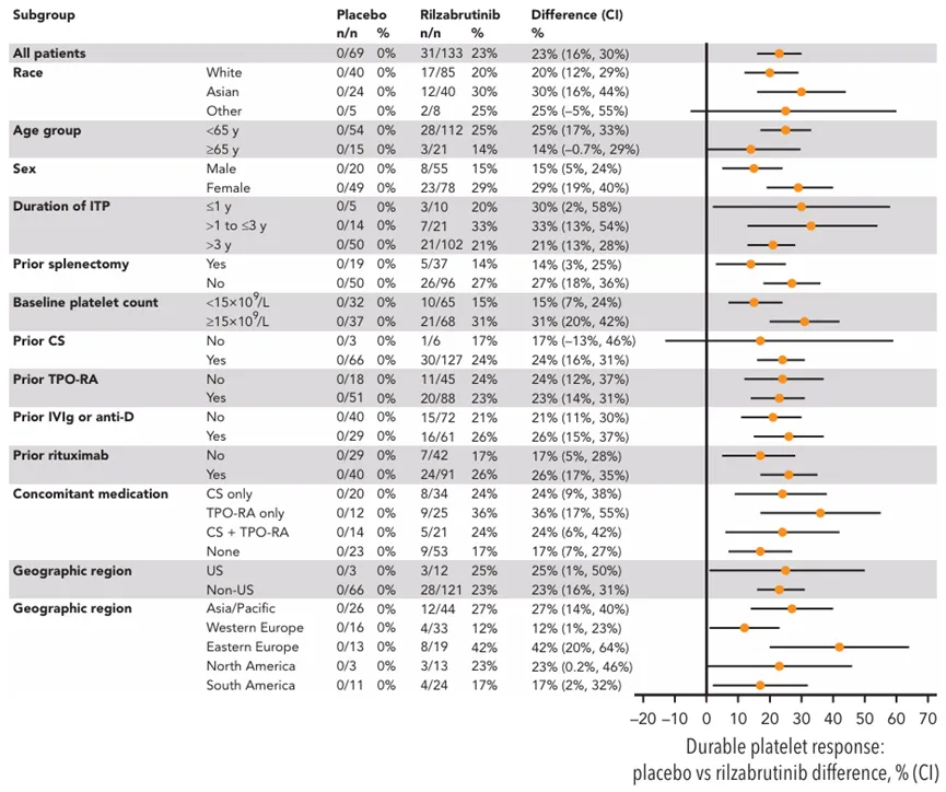Rilzabrutinib的上市申请是基于III期LUNA 3研究的积极数据。结果显示,在既往接受过治疗的持续性或慢性免疫性血小板减少症(ITP)患者中,Rilzabrutinib组产生持久血小板应答(即在没有挽救治疗的情况下,患者在24周双盲治疗期的最后12周中至少有8周血小板计数≥50000/μL)的患者比例显著高于安慰剂组(23% vs 0%,P<0.0001)。