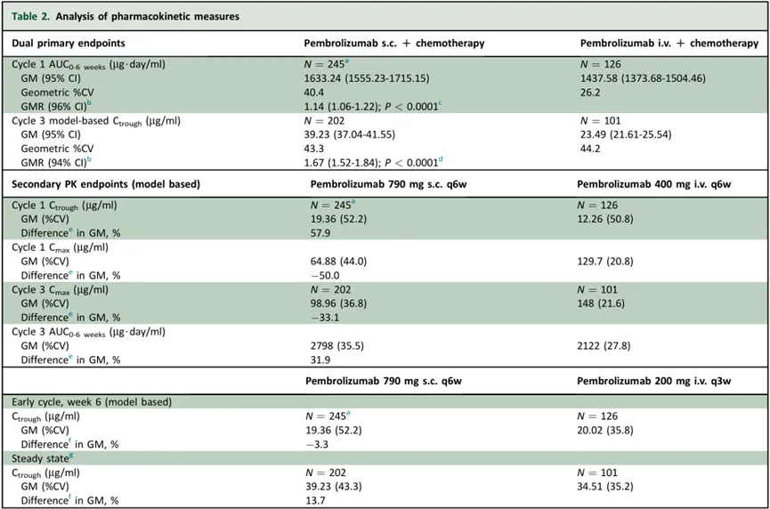 在该研究中,帕博利珠单抗皮下制剂的中位注射时间为2分钟。结果显示,与帕博利珠单抗静脉制剂(400mg,每6周1次)相比,帕博利珠单抗皮下制剂(790mg,每6周1次)在首个给药周期内,帕博利珠单抗的药时曲线下面积(AUC)暴露量显示出非劣效性(P<0.0001),且在之后的稳态下测得的帕博利珠单抗谷浓度(Ctrough)也显示出非劣效性(P<0.0001)。