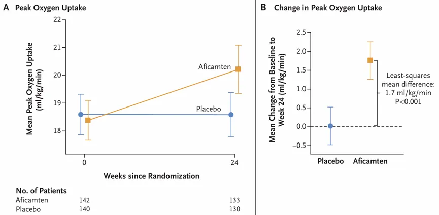 结果显示,治疗第24周,Aficamten组患者的运动能力显著提高,经心肺运动试验(CPET)评估的峰值摄氧量(pVO2)显著增加(1.8 vs 0.0 mL/kg/min,最小二乘差为1.7mL/kg/min,P<0.001)。此外,该研究也达到了所有次要终点(P<0.001)且数据具有临床意义,包括堪萨斯城心肌病问卷临床综合评分(KCCQ-CSS)变化、纽约心脏协会(NYHA)功能分级改善≥1级的患者比例、左心室流出道压力阶差(LVOT-G)变化等指标。