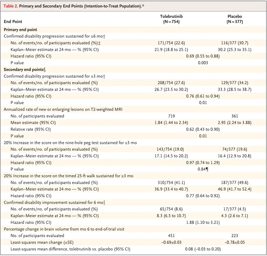 Tolebrutinib的上市申请是基于三项III期研究的数据。针对非复发性继发进展型多发性硬化症(nrSPMS)的HERCULES研究表明,Tolebrutinib组确认残疾进展的患者比例较安慰剂组更低(21.9% vs 30.2%,HR=0.69,P=0.003)。
