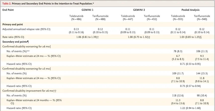 2研究未达到主要终点,即Tolebrutinib组的年化复发率与特立氟胺组之间无显著性差异(GEMINI 1研究:0.13 vs