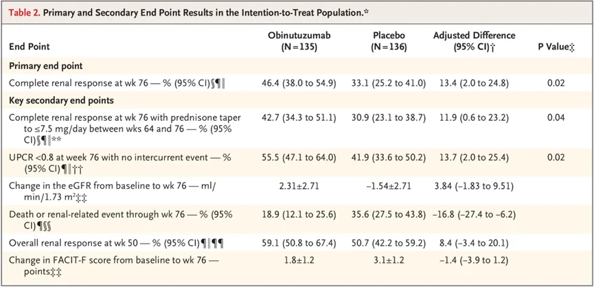 结果显示,在治疗第76周时,奥妥珠单抗组实现完全肾脏缓解(CRR)的患者比例更高(46.4% vs 33.1%,调整后差异为13.4%,P=0.02)。在第64-76周期间接受≤7mg/日泼尼松治疗的患者中,奥妥珠单抗组在第76周时实现CRR的患者比例更高(42.7% vs 30.9%,调整后差异为11.9%,P=0.04)。此外,奥妥珠单抗组在第76周时实现尿蛋白肌酐比值(UPCR)低于0.8且无并发症的患者比例也更高(55.5% vs 41.9%,调整后差异为13.7%,P=0.02)。