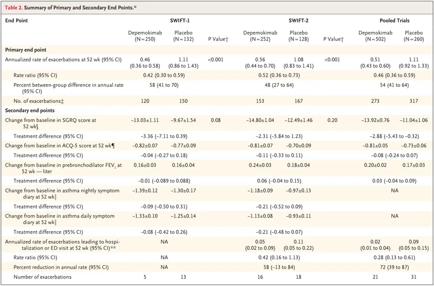 哮喘适应症的上市申请是基于两项III期研究(SWIFT-1和SWIFT-2)的积极结果。这两项研究共纳入了792例嗜酸性粒细胞表型重度哮喘患者。结果显示,治疗52周后,Depemokimab(100mg,皮下注射,每26周1次)联合标准治疗组患者的年化哮喘恶化率较安慰剂联合标准治疗组显著降低(SWIFT-1研究:0.46 vs 1.11,P<0.001;SWIFT-2研究:0.56 vs 1.08,P<0.001)。不过,在两项研究中,Depemokimab组与安慰剂组的圣乔治呼吸问卷(SGRQ)评分变化组间差异均无统计学意义。