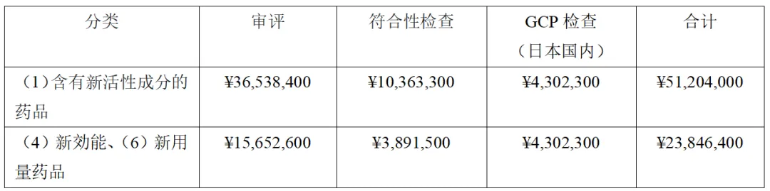 注册分类(1)的含有新活性成分的药品的注册申请时需支付的注册收费为36,538,400日元(折合人民币约179万元)(此外还需要符合性检查费用等。参考下表。)。另外,补充申请的新功效药品(注册分类(4))及新用量药品(注册分类(6))的注册收费分别为15,652,600日元(折合人民币约76.7万元)。