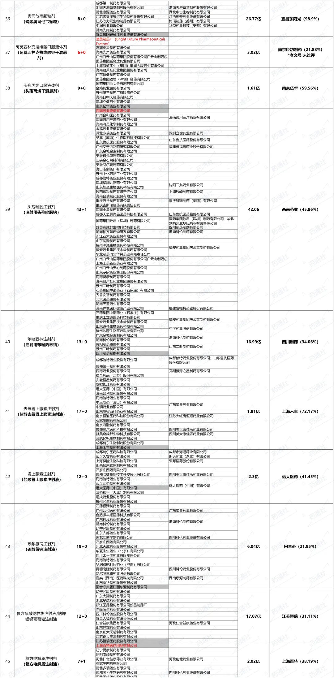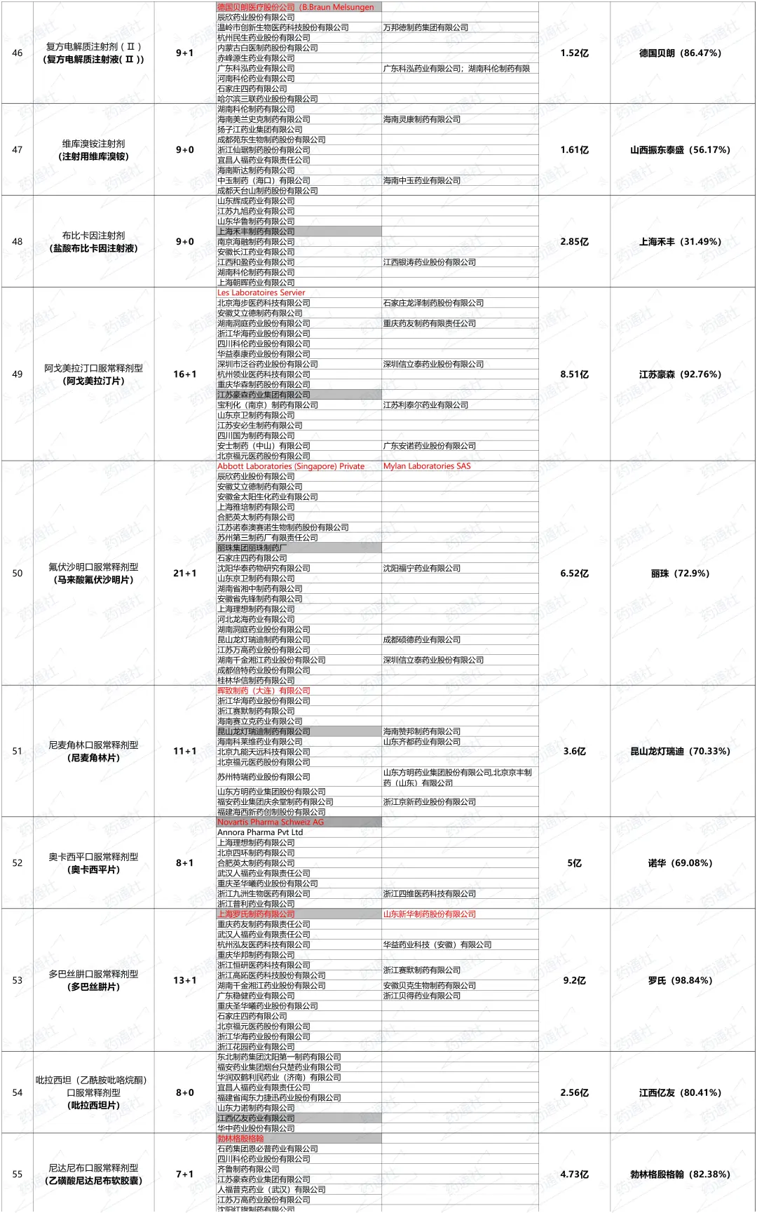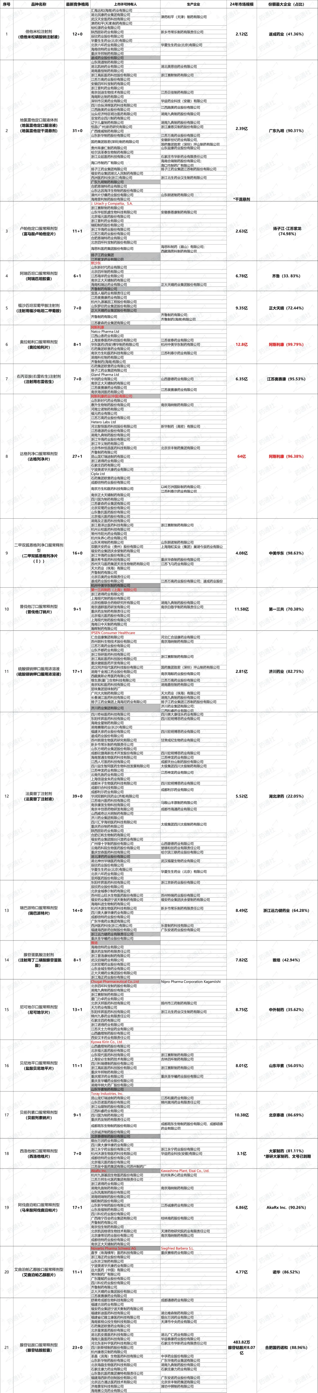 这两天更新了一下55个品种的最新竞争格局(截至7月16日),以及24年各品种的市场销售额和其中市场最大的企业。