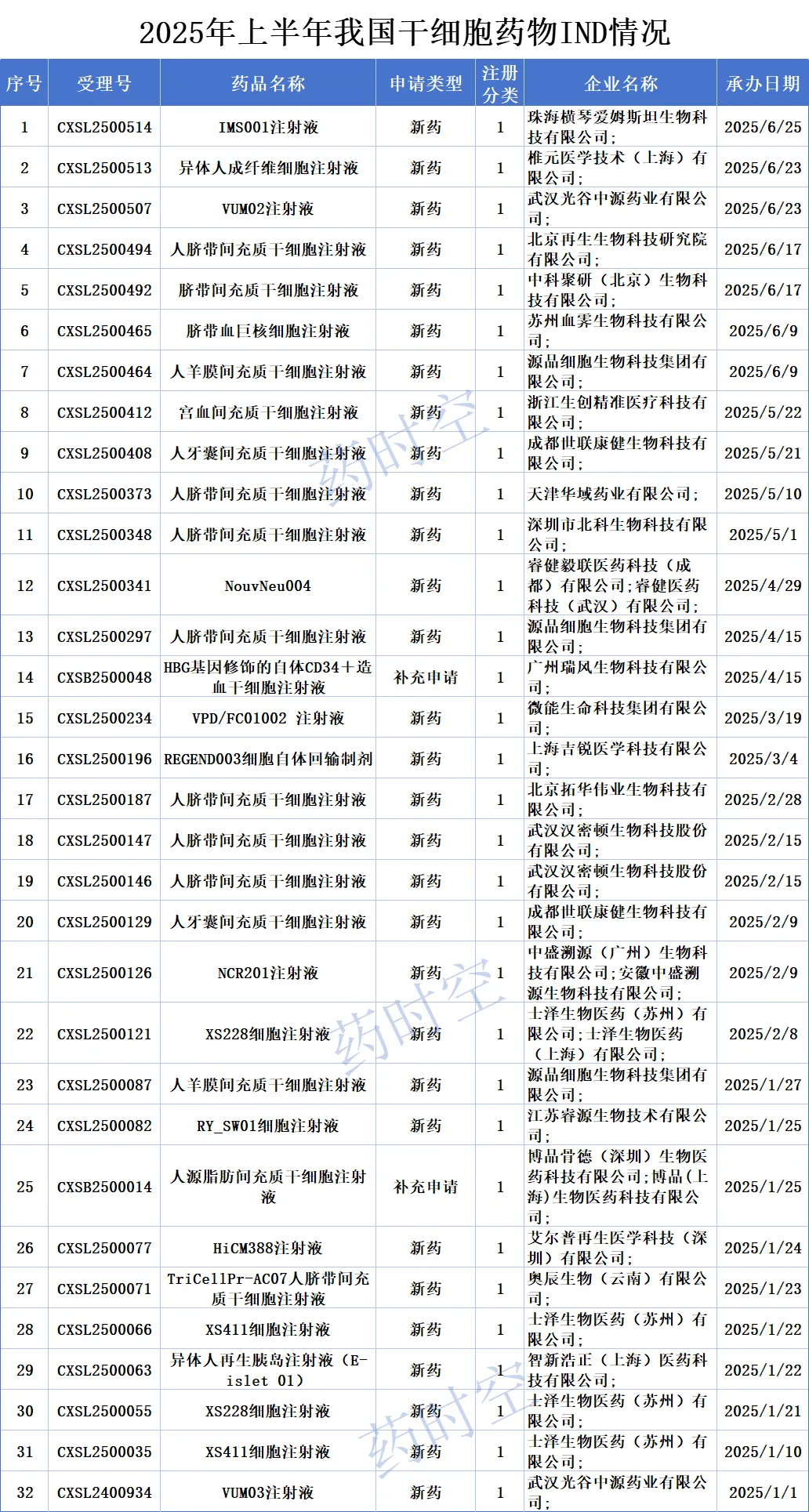 二、2025年上半年干细胞药物获临床试验默示许可情况
