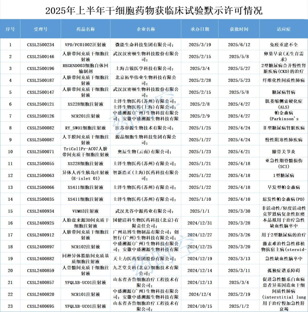 今年上半年,共有23款干细胞药物获得临床试验默示许可。