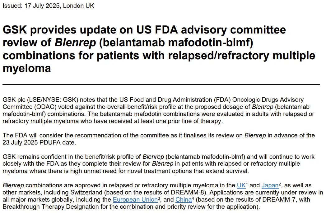 2025年7月17日,葛兰素史克(GSK)宣布FDA肿瘤药物咨询委员会(ODAC)以5:3的投票结果反对其BCMA ADC新药Blenrep用于复发/难治性多发性骨髓瘤(R/R MM)的二线联合治疗,理由是认为其风险大于收益。Blenrep的PDUFA日期为7月23日。