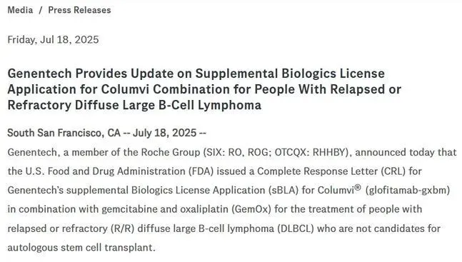 7月18日,罗氏及其子公司基因泰克(Genentech)宣布,美国食品药品监督管理局(FDA)拒绝批准Columvi联合化疗方案GemOx(吉西他滨+奥沙利铂)用于治疗不适合自体干细胞移植的二线DLBCL患者。