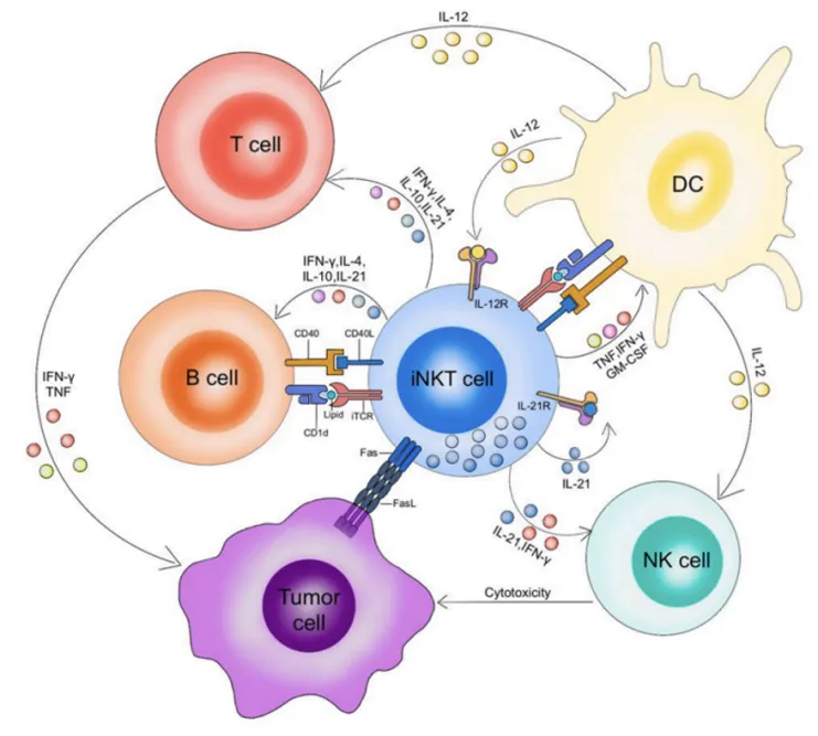 一旦被激活,iNKT细胞不仅能够直接杀死肿瘤细胞,还能够激活其他免疫细胞,如NK细胞和T细胞,共同努力对抗肿瘤。因此,它们被视为先天免疫系统和适应性免疫系统之间的重要联系。这种独特的免疫激活机制使得iNKT细胞疗法在治疗癌症方面具有独特的优势。