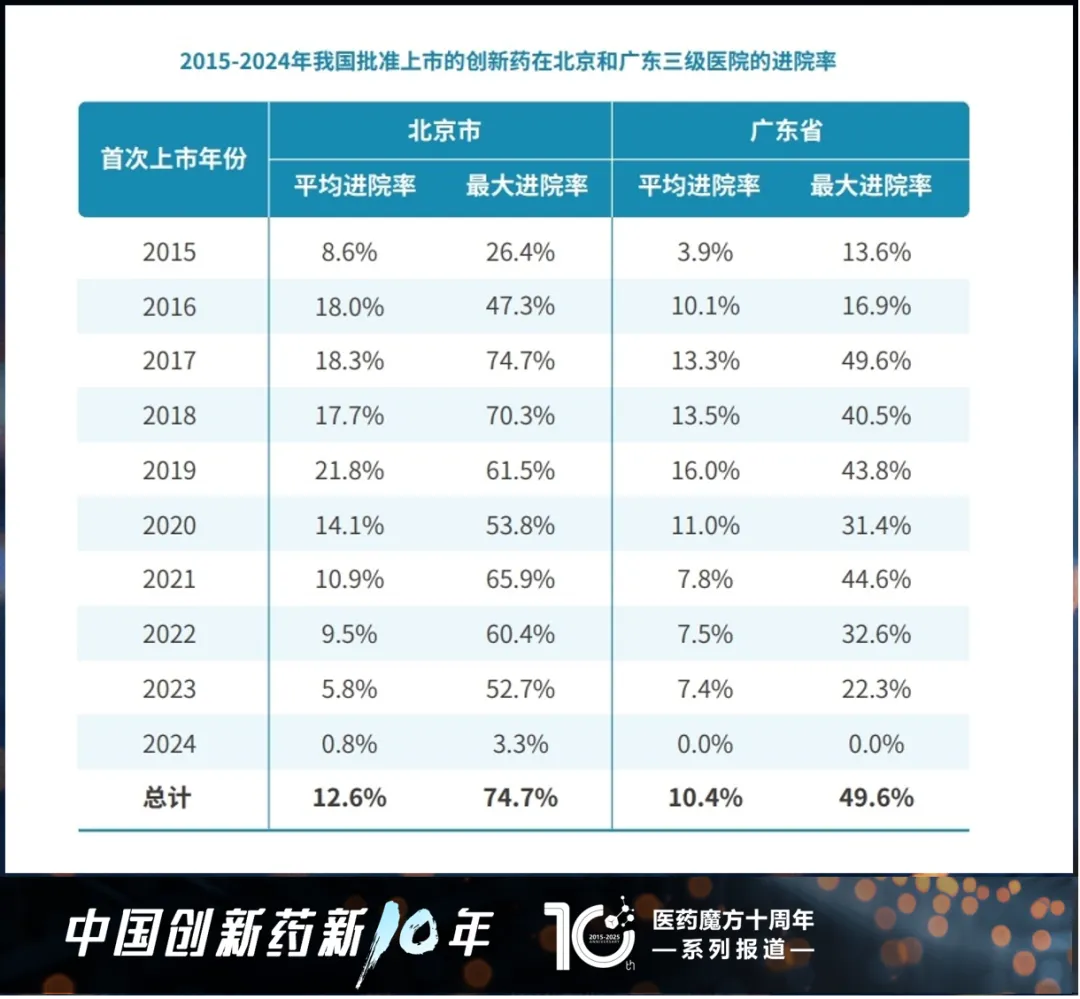 据医药魔方统计,以北京市和广东省为例,2015-2024年我国批准上市的创新药中,进入北京和广东地区三级医院用药目录的药品分别占50.6%和 49.1%,即大约一半的创新药因未进入三级医院用药目录而无法买到;即便是已进入目录的创新药,平均进院率也仅为12.6%和10.4%,患者只能在很有限的医院内买到。