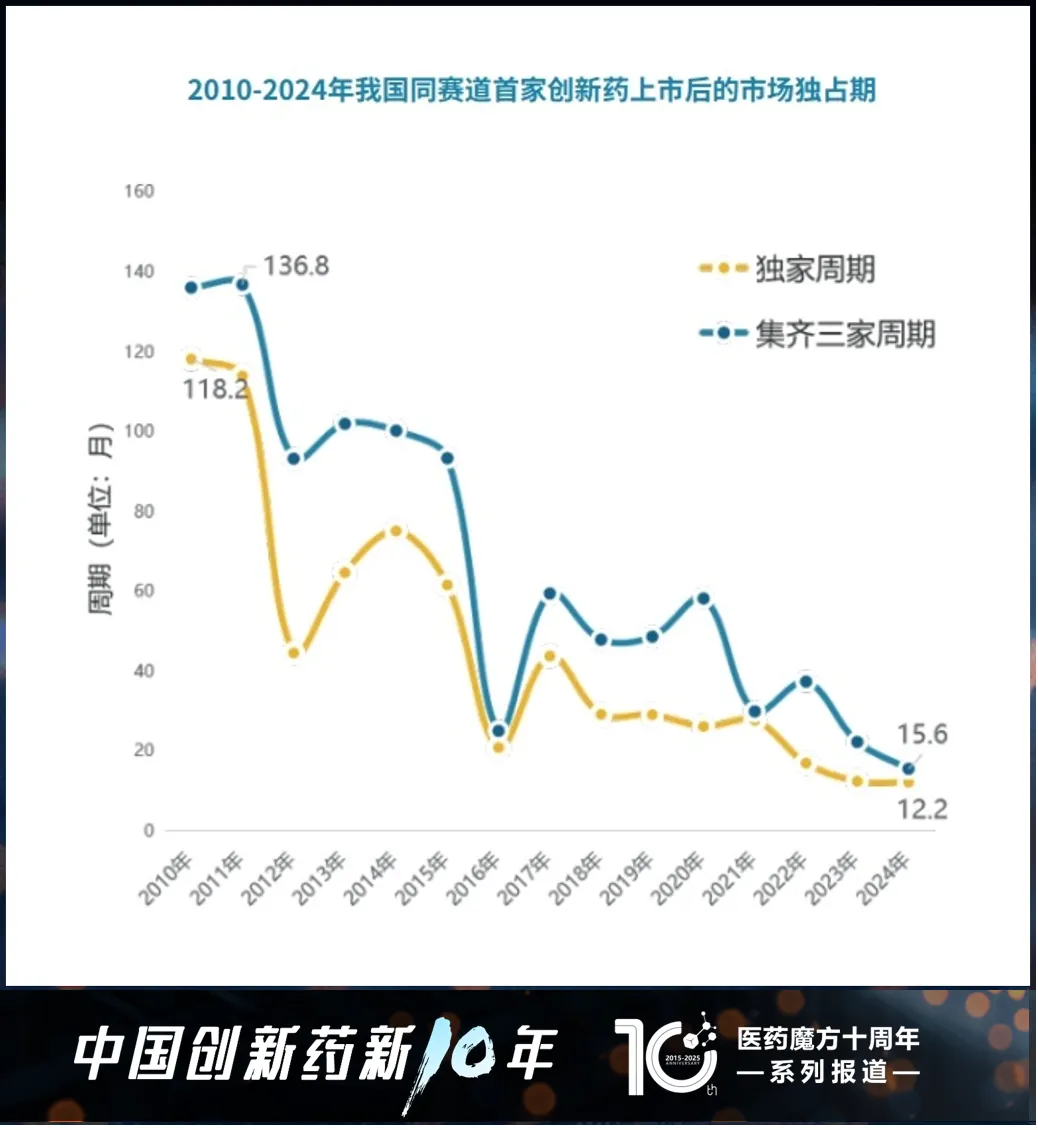 注:独家周期系指同赛道新药的首家上市日期与第二家上市日期的时间差;集齐三家周期系指同赛道新药首家上市日期与第三家上市日期的时间差(图片来源:医药魔方十周年系列报告《全球视野下的中国创新药产业:十年回顾与展望》)