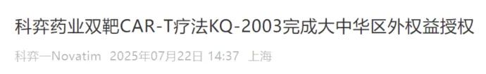 7 月 22 日,科弈药业宣布,与美国生物医药企业 ERIGEN LLC 就全球首个并联增强型双靶向 CAR-T 细胞治疗产品 KQ-2003(靶向BCMA/CD19)达成独家海外授权许可协议。