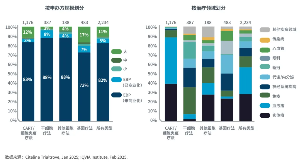 图1:2020-2024年按治疗领域和公司规模划分的细胞和基因疗法试验启动概况