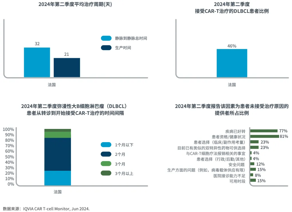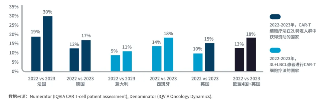 为研究不同国家患者获得CAR-T疗法的情况并揭示其中的差异,本报告分析了意大利、法国、德国、西班牙和英国的二线及以上R/R LBCL患者中接受CAR-T细胞疗法的患者比例(图2),包括可能有资格接受CAR-T细胞疗法的患者,但有些患者可能身体过于虚弱或合并症过多,不符合CAR-T细胞治疗的条件,或需要考虑其他药物治疗。2022年至2023年间,所有国家中之前未接受过CAR-T疗法的LBCL 2L+R/R患者接受CAR-T治疗的比例均有所上升。然而,各国的总体比例存在差异。2023年,法国接受CAR-T疗法的患者比例最高,为30%,意大利最低,为11%。各国CAR-T细胞疗法比例的差异可能由多种因素驱动,例如治疗中心的数量、转诊和治疗启动/给药流程以及报销政策等。各国CAR-T细胞疗法的不同利用率凸显了重新审视这些因素的必要性,以及需要深入分析各国的主要障碍和潜在解决方案。