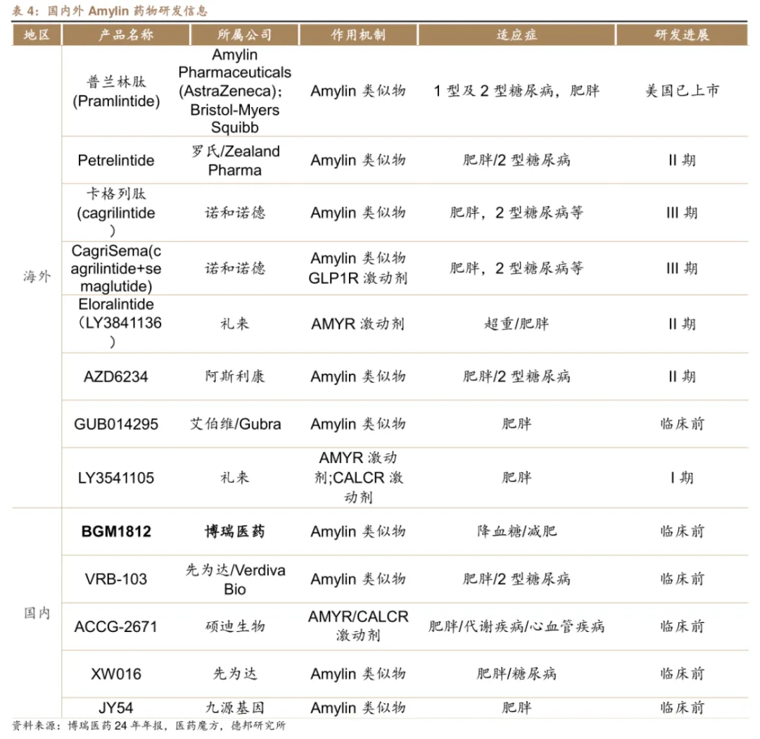 博瑞医药作为一家原料药制剂一体化企业,早年果断自研开发的多款减重管线,也为公司在创新药β行情下打进更多的估值;从减重管线拥挤度来看,出海潜力最强的或许是即将进入临床的长效胰淀素(Amylin)类似物BGM1812。