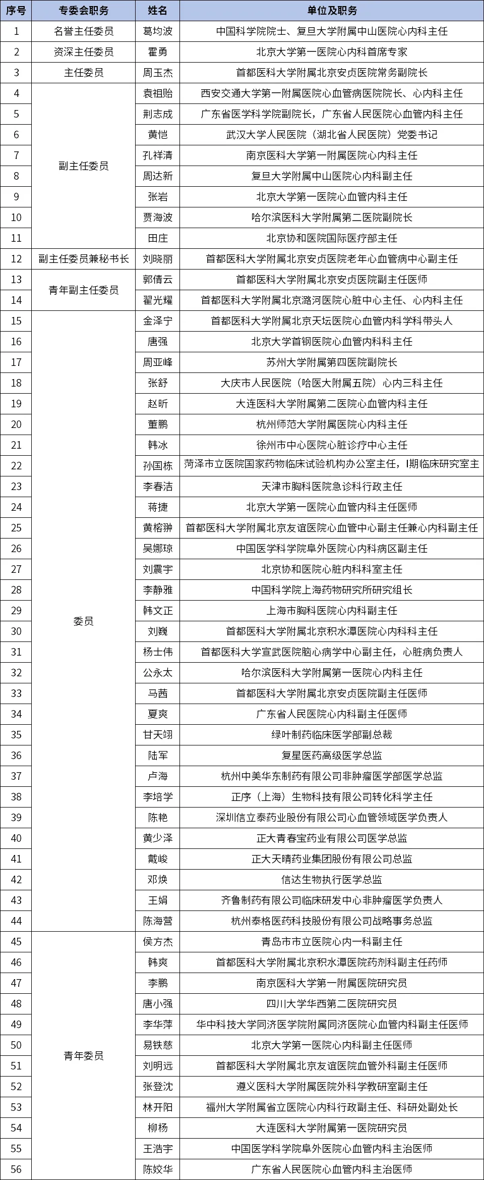 西安交通大学第一附属医院心血管病医院院长袁祖贻、广东省人民医院心血管内科主任荆志成、武汉大学人民医院(湖北省人民医院)党委书记黄恺、南京医科大学第一附属医院心内科主任孔祥清、复旦大学附属中山医院心内科副主任周达新、北京大学第一医院心内科主任张岩、哈尔滨医科大学附属第二医院副院长贾海波、北京协和医院国际医疗部主任田庄当选心血管专委会第三届副主任委员;首都医科大学附属北京安贞医院老年心血管病中心副主任刘晓丽当选心血管专委会第三届副主任委员兼秘书长;首都医科大学附属北京安贞医院副主任医师郭倩云、首都医科大学附属北京潞河医院心脏中心主任翟光耀当选心血管专委会第三届青年副主任委员。