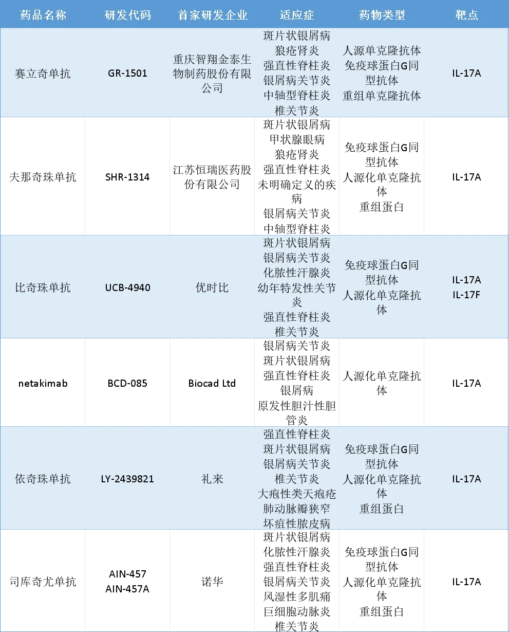 目前,全球共6款IL-17靶向药物获批上市,分别为赛立奇单抗(智翔金泰)、夫那奇珠单抗(恒瑞医药)、比奇珠单抗(UCB)、netakimab(Biocad/上药博康)、依奇珠单抗(礼来)和司库奇尤单抗(诺华),其中仅比奇珠单抗为IL-17A/IL-17F单抗,其余5款均为IL-17A单抗。