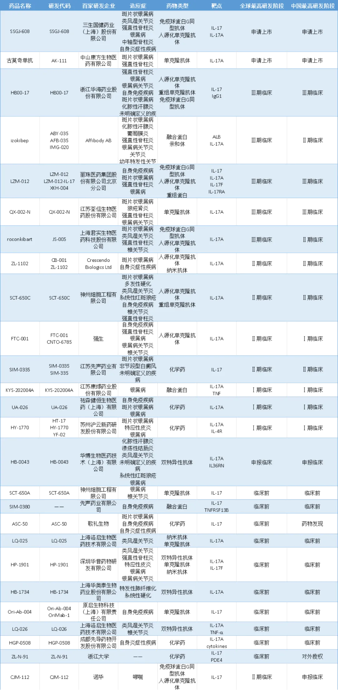 SSGJ-608(三生国健)、古莫奇单抗(康方生物)也已申报上市。根据摩熵医药数据,目前国内还有24款IL-17靶点创新药物在研,这些在研品种覆盖了IL-17A、IL-17A/F、IL-17RA等多个亚型,涉及单抗、双抗、融合蛋白等多种分子形式,适应症主要集中在银屑病、强直性脊柱炎、银屑病关节炎等自免炎症领域。从企业布局来看,荃信生物、君实生物等本土创新药企已进入临床III期阶段。