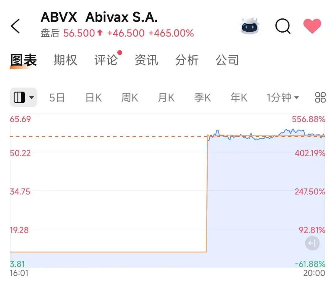 受临床数据发布催化,Abivax公司的股价盘后飙升465%,公司市值也从6.34亿美元飙升至约35.82亿美元。
