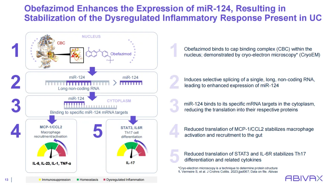 本文的主角Obefazimod的机制有点像miRNA模拟物的作用机制,即与帽结合复合物(CBC)形成诱导物,促进长非编码RNA的剪接,导致miR-124的表达增强,而在溃疡性结肠炎、类风湿关节炎模型中,miR-124上调可减少IL-23/IL-17 轴活性,从而导致相关的抗炎缓解作用。