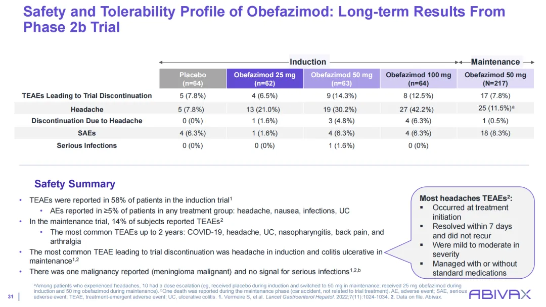从Obefazimod的2b期长期随访研究的安全性来看,治疗期间最常见的不良反应是头痛,导致试验中断的最常见TEAE是诱导期的头痛和维持期的溃疡性结肠炎,这些并非是miRNA模拟物常见的不良反应(如细胞因子风暴、因递送载体带来的其他毒性)。
