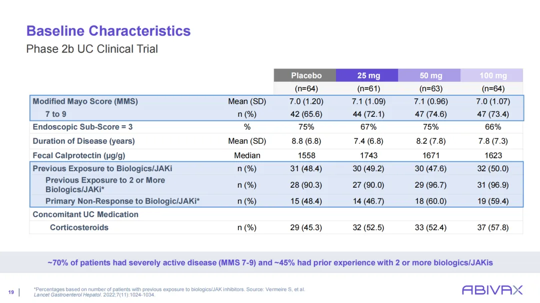 可以先从Obefazimod的2b期研究来看,入组人群的核心要点有3个:1)梅奥评分在7-9分的人群基本上均超过70%,这些患者有严重活动性疾病;2)近50%入组人群接触过生物制剂/Jak抑制剂,并且其中90%接触过两种或以上的生物制剂/Jak抑制剂;3)患者疾病持续年限普遍在7-8年以上。