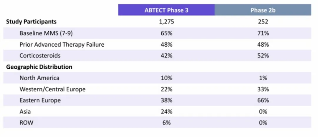 从第三阶段研究设计对比二期入组人群来看,梅奥评分在7-9分的人群比例是65%对71%,同时经两项生物制剂或先进疗法的患者比例均为48%,不过第三阶段使用皮质类固醇患者比例有所下降(42%对52%,更好管控安慰剂效应),另外三期研究还增加了人群多样性。