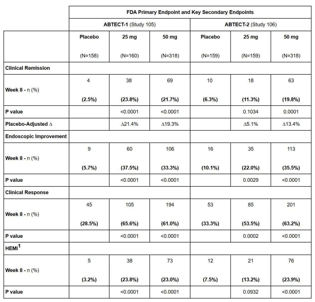 7月22日,Abivax公司宣布了其核心管线Obefazimod两项为期8周的ABTECT诱导试验的积极3期结果,在治疗中度至重度活动性溃疡性结肠炎的ABTECT-1、ABTECT-2研究中Obefazimod治疗组分别取得了安慰剂调整缓解率为19.3%(p<0.0001)、13.4%(p=0.0001)。