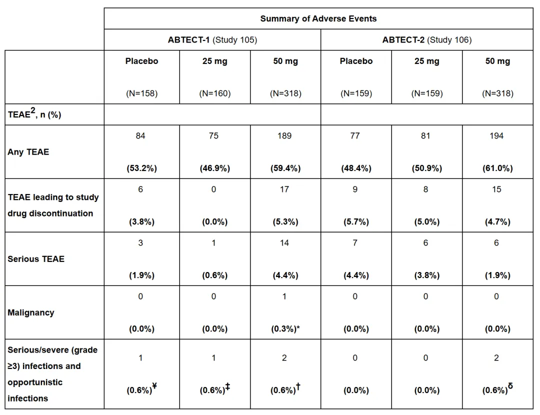 更值得注意的是,随着试验人群规模增加,反而相比2b期因为TEAE而中断试验的患者比例在变少,这也是一个非常积极的信号(2b期50mg治疗组的退出率分别为14.3%、7.8%)。