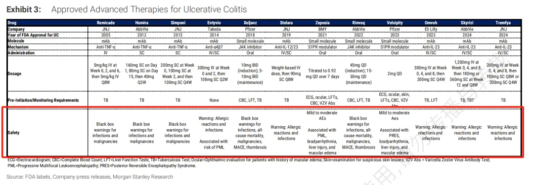 再者对比现有上市药物的安全性审视,Obefazimod的安全性也算非常扎眼的,不良反应可控(类似严重感染的发生率非常低)。