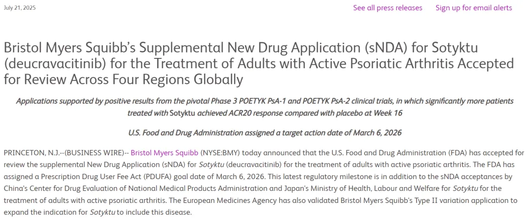 2025年7月21日,百时美施贵宝宣布TYK2抑制剂Sotyktu治疗银屑病关节炎的新适应症上市申请获得FDA受理,PDUFA日期为2026年3月6日。Sotyktu此前已经获批治疗斑块型银屑病。