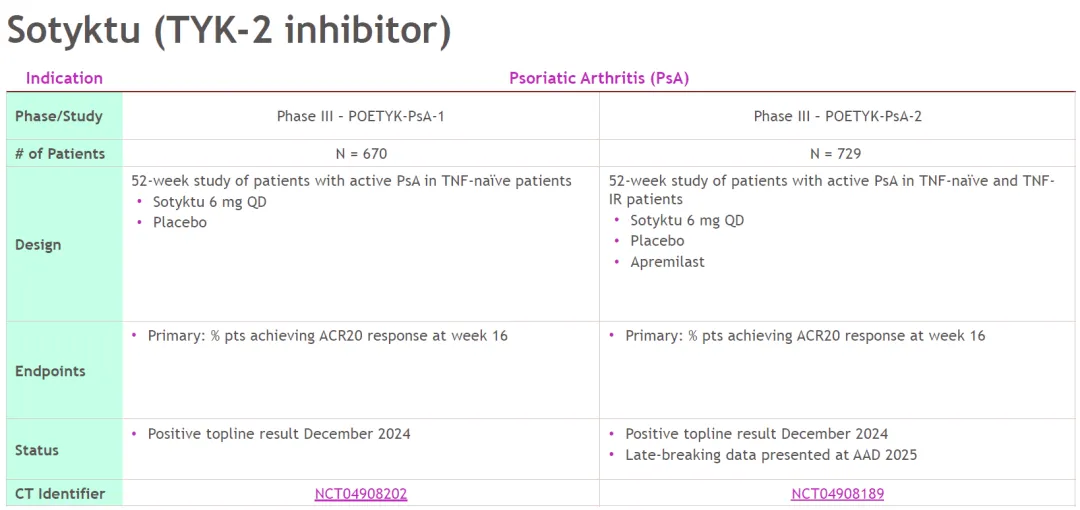 Sotyktu此次上市申请是基于POETYK-PsA-1和POETYK-PsA-2两项三期临床的数据,这两项三期临床在2024年底读出阳性数据,主要终点为治疗16周ACR20缓解比例。2025年3月,百时美施贵宝在AAD会议上公布了POETYK-PsA-2的临床数据,治疗16周。54.2%的患者达到ACR20,安慰剂组这一比例为39.4%。