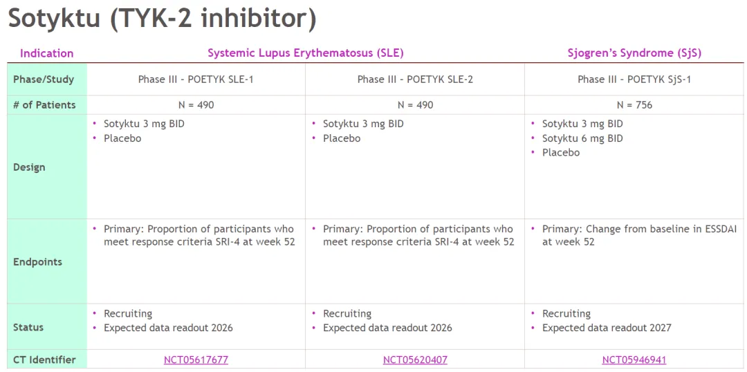 除了银屑病和银屑病关节炎以外,Sotyktu还在探索系统性红斑狼疮、干燥综合征等自免适应症,其中系统性红斑狼疮有两项三期临床在进行中,干燥综合征有一项三期临床在进行中,预计分别于2026年、2027年读出顶线数据。