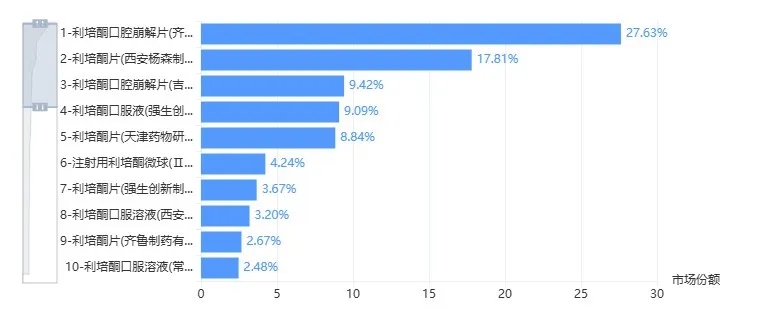 根据药智数据【药品全终端销售分析系统】显示,2024年国内市场上利培酮销售额接近7亿元,其中齐鲁制药研发的口崩片占比最高,达到了 27%。齐鲁制药此次推出改良型新药,有望在利培酮市场占据更多份额。