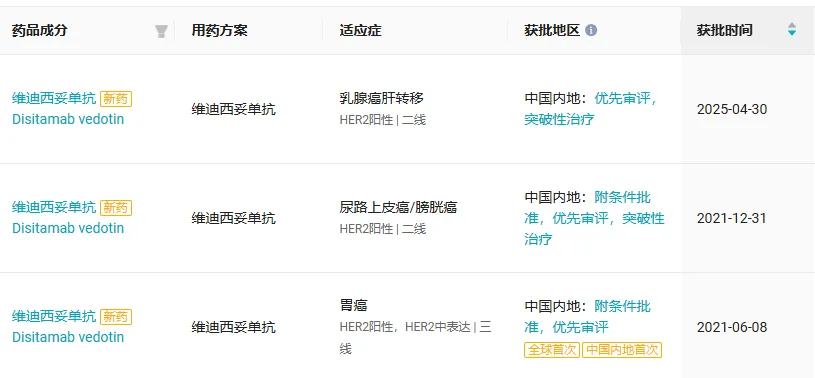 维迪西妥单抗是首个获批的国产 HER2 靶向 ADC ,此前已在国内获批 3 项适应症,涵盖胃癌、 尿路上皮癌、乳腺癌(详见下图)。今年 6 月,维迪西妥单抗的第 4 项适应症上市申请也已获得 CDE 受理,用于 HER2 低表达乳腺癌的二线治疗。