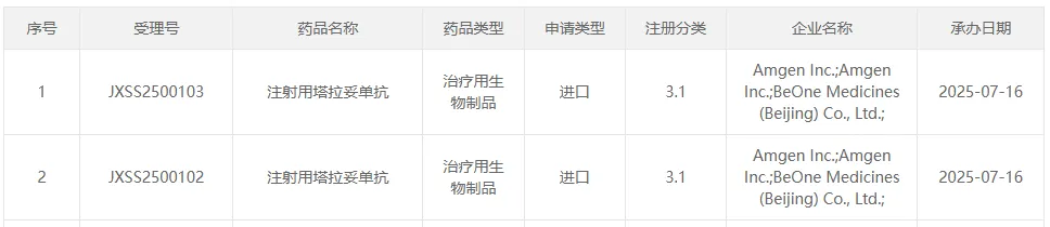 7 月 16 日,安进和百济神州的注射用塔拉妥单抗申报上市,用于广泛期小细胞肺癌 (ES-SCLC) 成人患者的三线治疗。该申请已被纳入优先审评。